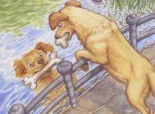 Açgözlü Köpek Masalı Sevinçle kemik parçasını dişlerinin arasına almış. Başka arkadaşları kemiği görüp isterler diye, ıssız bir yere götürüp, orada yemeyi düşünmüş. Koşa koşa şehrin dışındaki bir armana